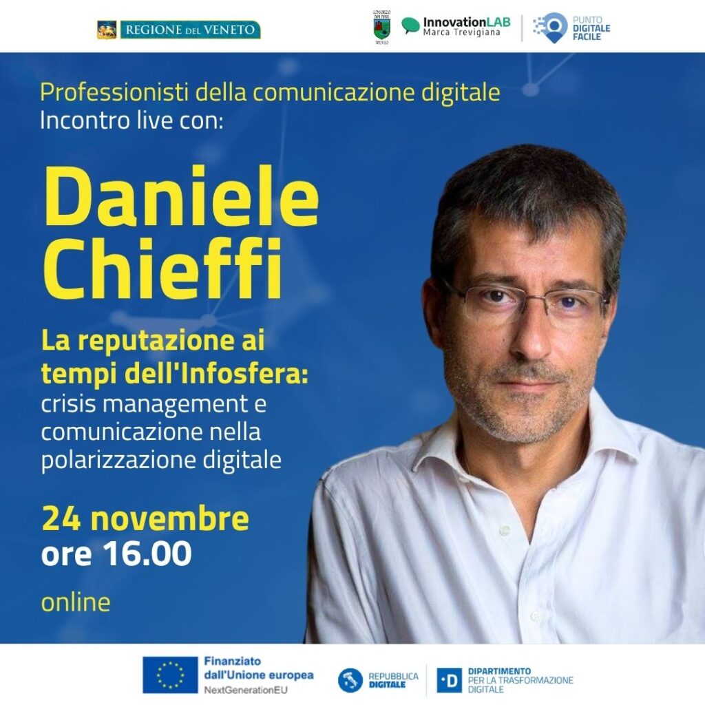 Di questo parlerà Daniele Chieffi nella live di InnovationLab Marca Trevigiana in programma lunedì 24 novembre 2025 dalle 16:00 alle 17:00, dal titolo “La reputazione ai tempi dell’Infosfera: crisis management e comunicazione nella polarizzazione digitale”.